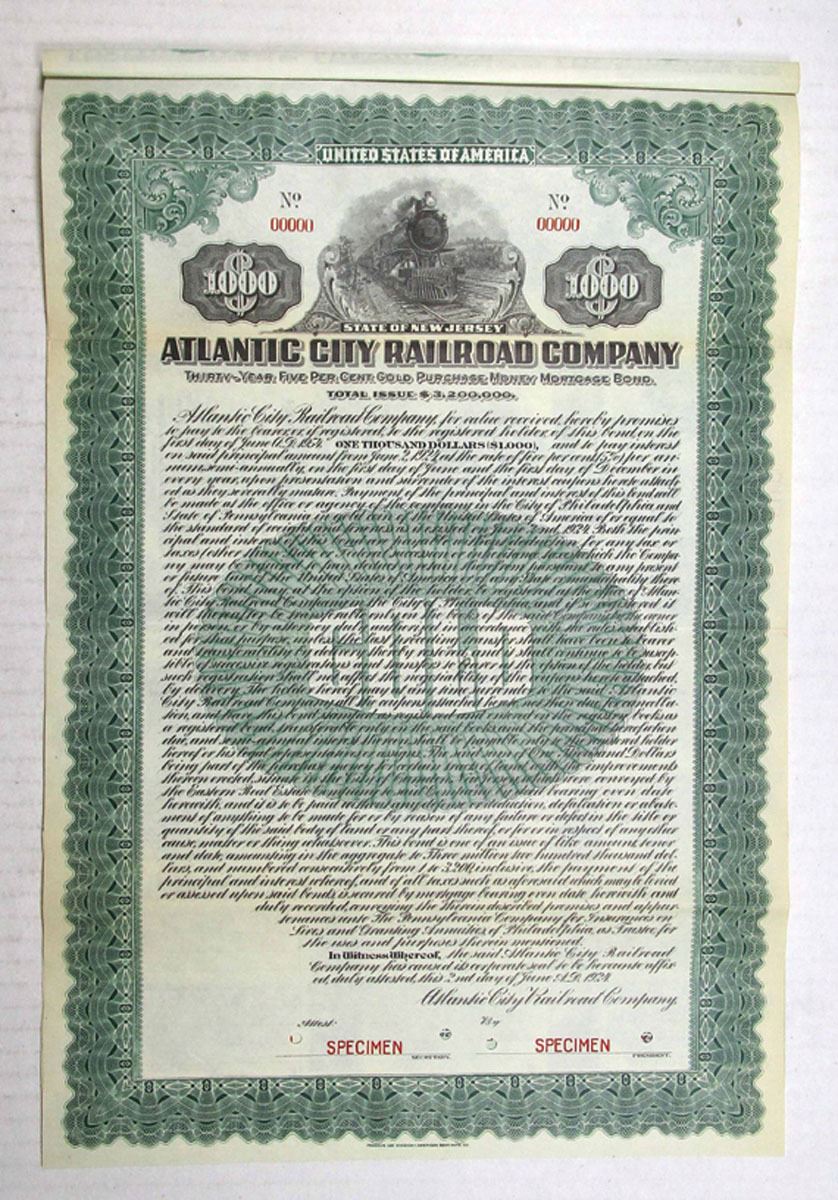 New Jersey, 1924. $1000 Specimen 5% Gold Purchase Money Mortgage Coupon Bond, Black on green underprint, locomotive almost straight on at top, specimen overprints, POC's, VF-XF condition, ABNC.
