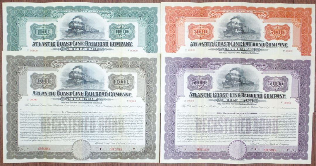 Virginia, 1909. Lot of 4 pieces all are 4% Registered Unified Mortgage Gold Bonds with same design of locomotive 969 on top middle over title, Includes $1000 Specimen in green; $5000 Specimen in orange; $10,000 Specimen in brown; and $50,000 Specimen in purple. All have red specimen overprints, 00000 serial numbers, and POCs. VF condition, ABNC. All are unlisted designs in Cox, Very Rare. (4)