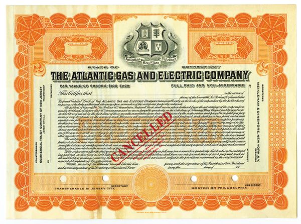 Connecticut. Odd Shares Preferred Stock Specimen Certificate, Black print on large orange border and under tint, Company logo at top, Cancelled overprints and POC's, Fine-VF condition with large stain down center of certificate condition, SBNC.
