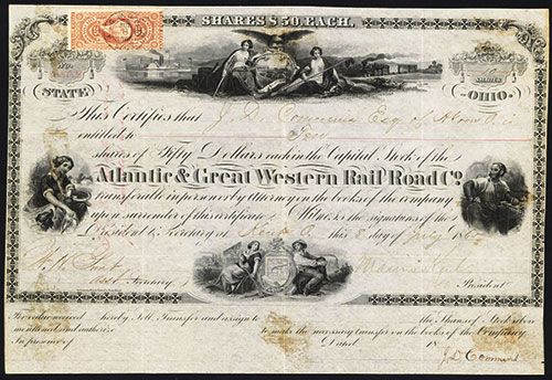 Ohio, 1865, 10 shs., Issued Stock and Uncancelled, 25 cent revenue stamp attached, VF. ABNC.