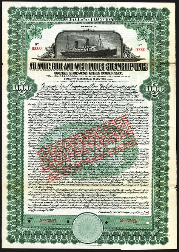 NY. $1000. Specimen Series B, Coupon Bond, Black on green border and under print, Steamship L-R on top, Specimen overprints, Diagonal red overprint of Supplemental Agreement in middle. Fine condition with light archival reinforcement of the horizontal top folds, FLD-ABNC. Only 2 of this variety found in the archives.