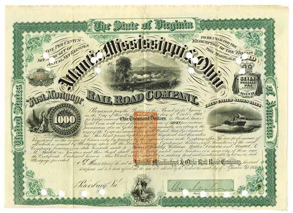 Virginia. $1000 Cancelled 7% 1st Mortgage Gold Bond, Black print on green border on large sized certificate, Multiple images on certificate including a large one of a locomotive passing a mountain, POC's, Fine condition with toning, CBNC. Signed by William Mahone as President. Mahone was a U.S Senator from Virginia during the 1880's and reached the rank of Major General of the Confederate Army.