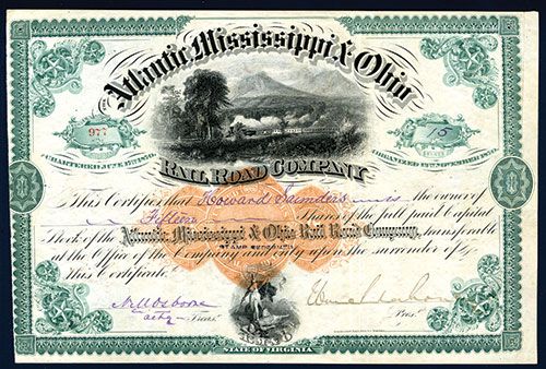 Virginia, 1881, 15 Shares, Issued Shares, Black on green border and underprint, Moving locomotive top center with mountains in background, VF condition.