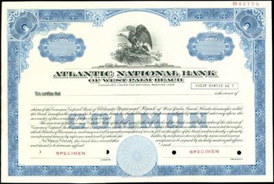 West Palm Beach, FL. 1930-1940's. Stock specimens. 1) Atlantic National Bank of West Palm Beach. Eagle vignette. Odd shares, blue. National Bank Charter #13300. Only 8 small size national banknotes are known from this bank. Values for notes are over $1000 each. Rare bank. 2) Commonwealth Bond and Mortgage Company. Vignette of Native American Indian sighting Sailing Ship. Odd shares, brown. 3) Lee County Bank Title and Trust Company of Fort Myers, Florida. Eagle vignette. Odd shares, orange. SBNC and SCBNC. VF to XF.