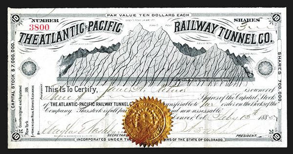 Colorado, 1885, 3 Shares, I/U stock certificate, cut away view of mountain with tunnel with train, S/N 3800, gold foil seal, VF. Scarce stock certificate.
