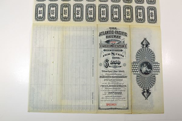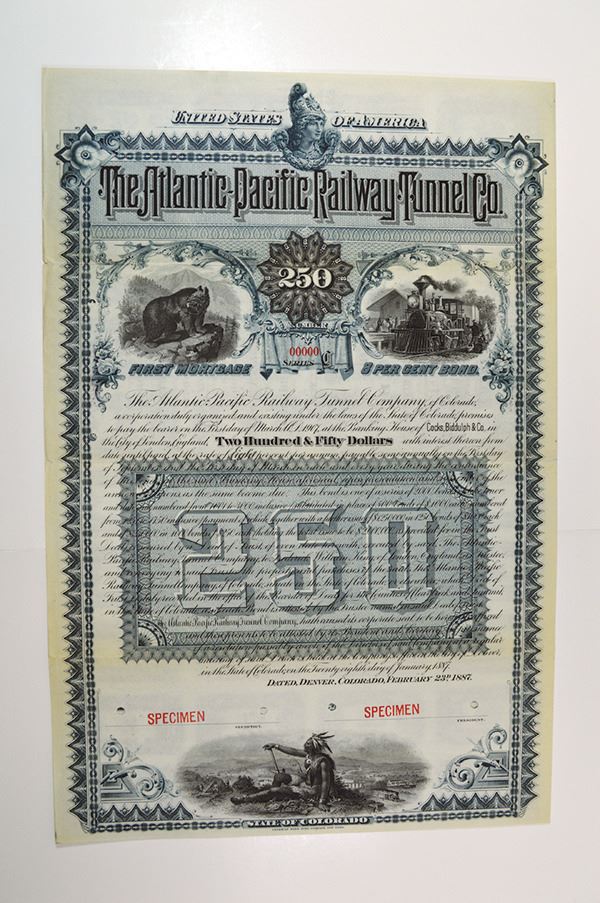 Colorado, 1887, $250 1st Mortgage 8% Specimen Bond, Black printing with blue border and underprint, Bear and locomotive top left and right with sitting Native American bottom center, POC's and red SPECIMEN overprints, ABNC. Listed railroad and bond in Cox.