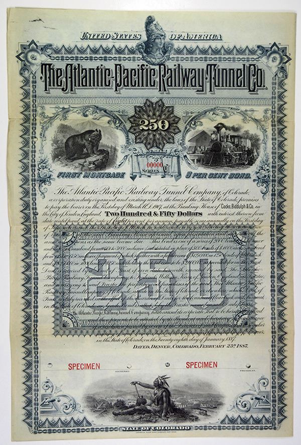 Colorado, 1887 Specimen $250 Series C, First Mortgage 8% Coupon Bond, Black text with blue border and undertint, Allegorical scene of bear looking over wilderness on left, Train pulling into station scene at right and native American viewing Progress at bottom. Red specimen overprints, "00000" serial number and POC's, VF condition with slight archivally reinforced splitting along left folds, ABNC NY. Rare as a specimen in Cox. Only 3 found in the ABN Archives.