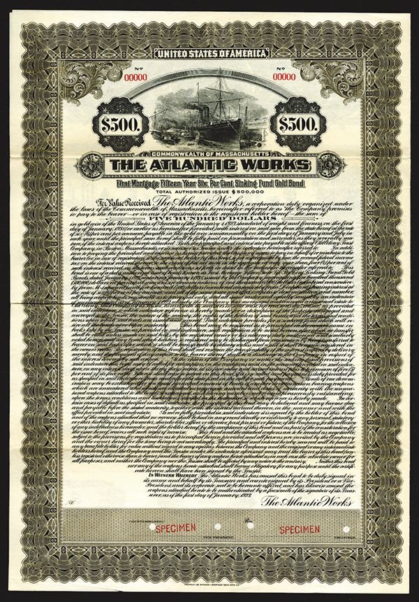 Massachusetts. $500 Specimen 6% First Mortgage Sinking Fund Gold Coupon Bond. Black print with a black/brown border and under tint. Vignette of a ship near pier at top. Specimen overprints, POC's, VF-XF condition with coupons attached. FL-ABNC, EF. The Atlantic Works built and repaired ships and engines at its plant in East Boston from 1853 to 1951.