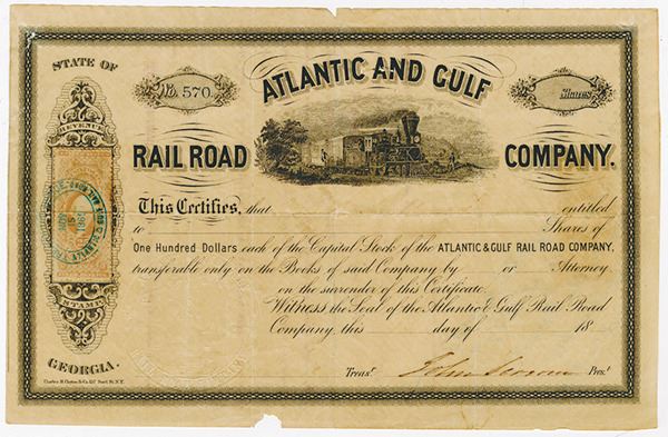 Georgia. Odd Shares Capital Stock Certificate, Black print on black border, Company title at top around steam locomotive, Fine condition with toning on certificate and cracking on bottom, Charles H. Clayton & Co.