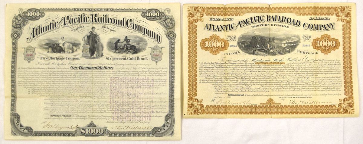 Various States, 1880. Lot of 2 I/U Bonds for the Atlantic and Pacific RR and specifically the Western Division, Bonds are in VF condition. (2). Sold "AS IS" no returns accepted.