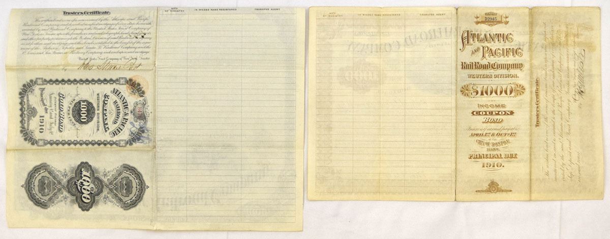 Various States, 1880. Lot of 2 I/U Bonds for the Atlantic and Pacific RR and specifically the Western Division, Bonds are in VF condition. (2). Sold "AS IS" no returns accepted.