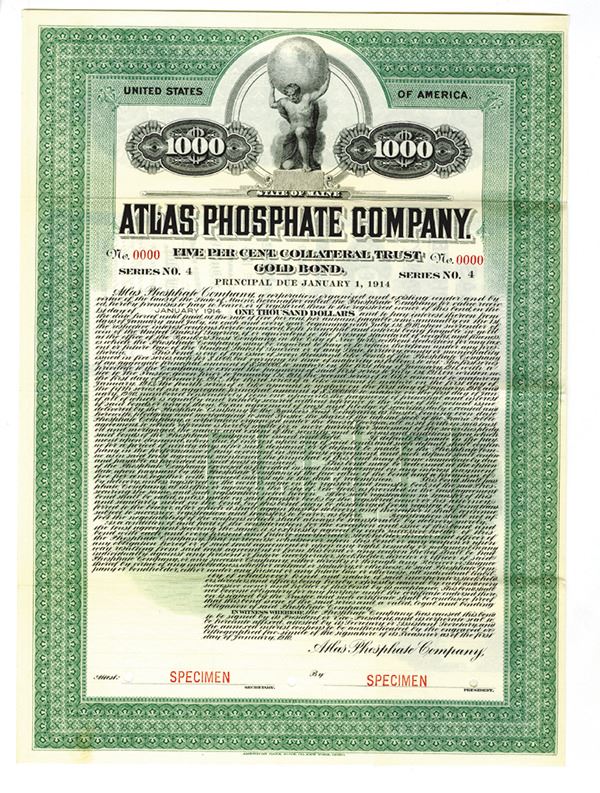 Maine, 1910. $1000 Specimen 5% Collateral Trust Gold Coupon Bond, Black text with green border and undertint, Figure of Atlas at top holding a globe. Red specimen overprints, 0000 serial numbers, POCs. VF condition, ABNC.
