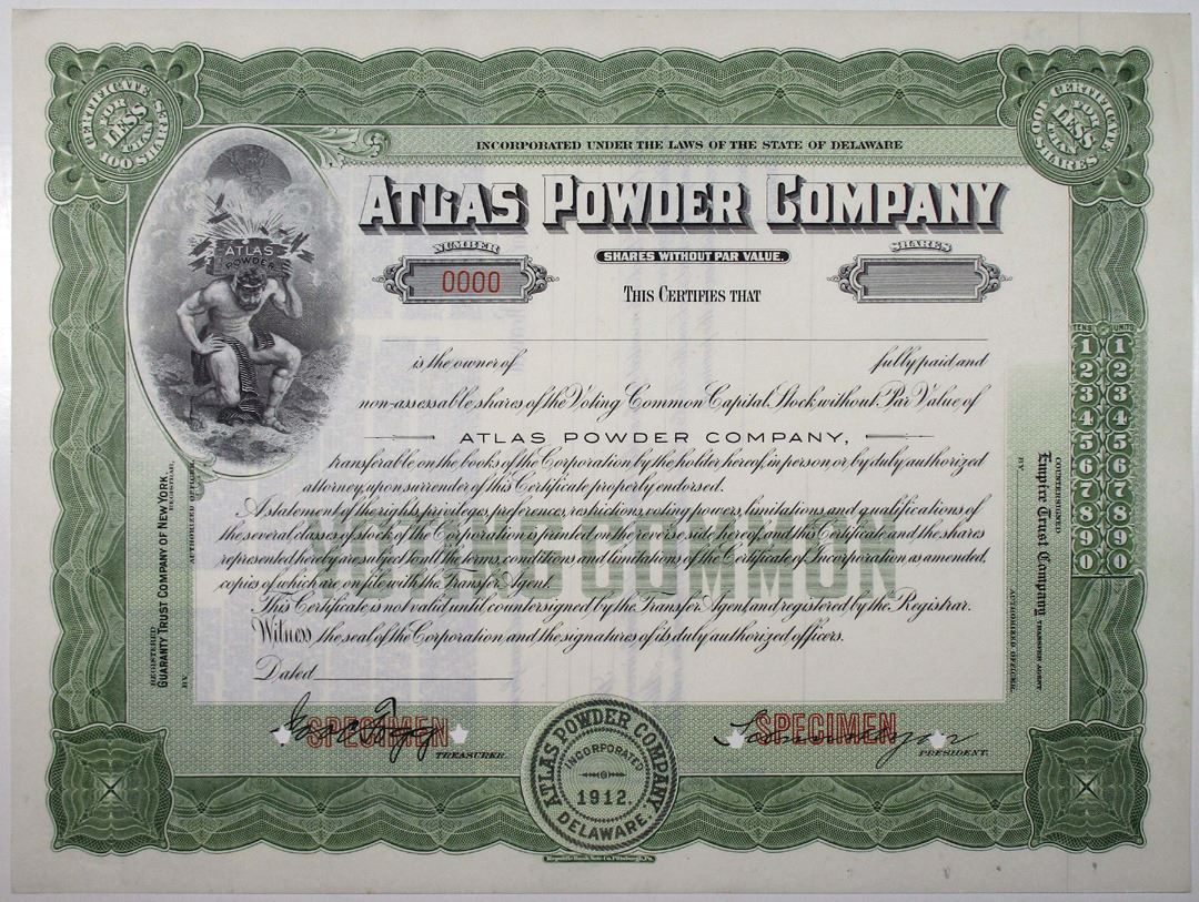 Delaware, ND (1912). <100 Shares Specimen Voting Capital Stock Certificate, Black text with light green border and underprint, Atlas depicted at top left corner. Red specimen overprints, 0000 serial number, and POCs. XF condition, RBN. In 1911, the United States won a lawsuit that it had brought against the Du Pont corporation under the Sherman Antitrust Act. The U.S. Circuit Court in Delaware found that Du Pont had been operating an unlawful monopoly, and ordered a breakup of its explosives and gunpowder manufacturing business. The breakup resulted in the creation of two new companies in 1912, Atlas Powder Company and Hercules Powder Company. Atlas received the explosives manufacturing portion of Du Pont's business (including the facilities acquired from the Giant Powder Company), while Hercules received the gunpowder portion. Historic Gun powder and explosives company stock certificate.