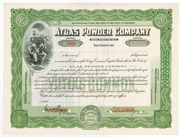 Delaware. <100 Shares Voting Common Capital Stock Specimen Certificate, Black print on ornate green border and under tint, Company title at top with image of Atlas to left holding exploding box of powder, Specimen overprints and POC's, VF-XF condition, RBNC. In 1902, the company subsequently purchased several smaller chemical companies, and in 1912 these actions gave rise to government scrutiny under the Sherman Antitrust Act. The courts declared that the company's dominance of the explosives business constituted a monopoly and ordered divestment. The court ruling resulted in the creation of the Hercules Powder Company (now Hercules Inc.) and the Atlas Powder Company (now AstraZeneca). Rare and historic DuPont related explosive companies.
