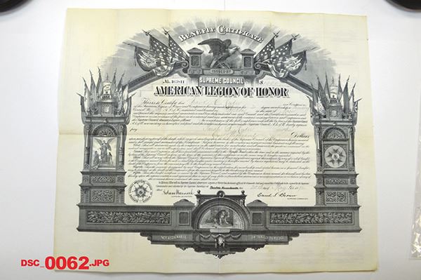 Lot of 2 different policies, 1853, Washington County - Mutual insurance Co. certificate and Supreme Council of American Legion of Honor, 1892 ornate insurance policy. Fine to VF condition.