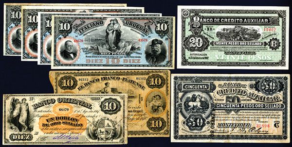 Uruguay, Lot of 8 notes, Includes Banco Italiano Del Uruguay (4), all 1887, 10 Pesos Remainders by ABNC; 1887, Banco Credito Auxiliar, 20 Pesos, Unc. and 50 Pesos, VF-XF with Uruguay Revenue stamp on back, local printer; 1867, Banco Oriental, 10 (Un Doblon De Oro Sellado), Issued, VF with a small thin on the back right margin, possibly from previous mounting, ABNC; and 1871, Banco Franco Platense, 10 Pesos en Billetes de Curso Legal, Issued, Fine to Fine+, ABNC. Attractive banknote assortment.