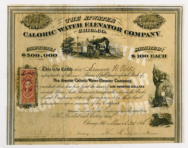 Chicago, IL. 10 Shares, I/U Stock Certificate, mustard yellow, train, revenue stamp, S/N 10, VF condition. (Ex. John E. Herzog Collection)