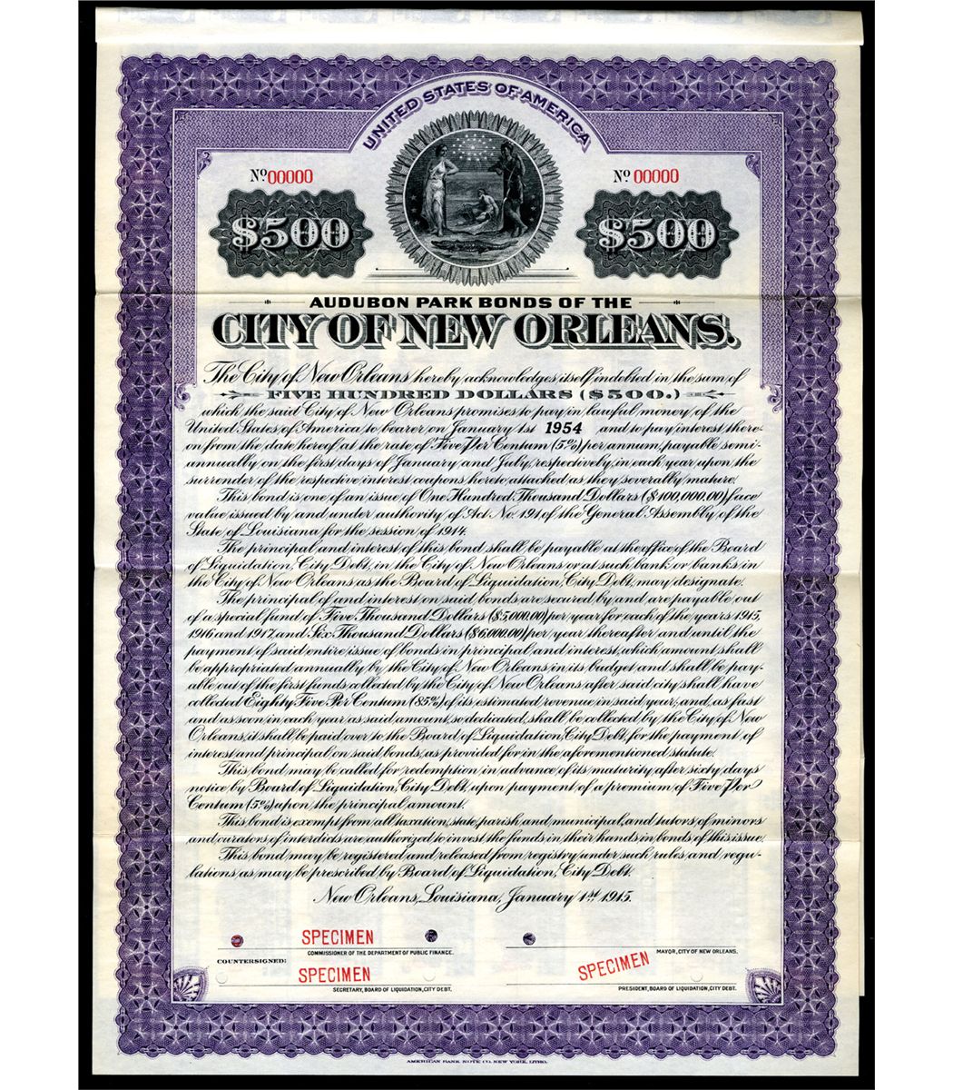 New Orleans, LA. Specimen bond, Arms of New Orleans on top, XF condition, only 3 found in archives 10 years ago. ABNC.