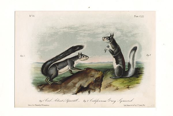 Quadrupeds of North America, Octavo edition. Col. Albert's Squirrel, California Grey Squirrel. Plate cut from book, now mounted. Slight foxing. J.W. Audubon, Imprint and colored by J.T. Bowen Phil. Probable reproduction.