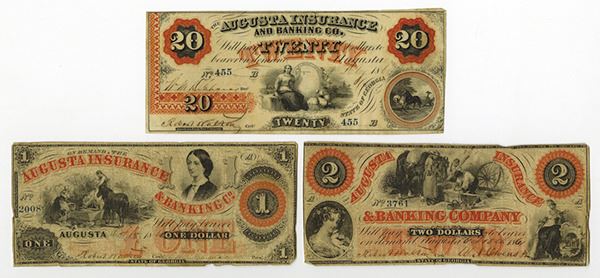 Augusta, Georgia, Lot of 3 issued Notes, Includes $1, 1860 and $2, 1861, Fine to Choice Fine condition and $20, 1860, VF, S/N 455, Very attractive trio of notes, ABNC.