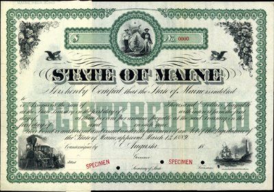 1889. $-Odd. Specimen state bond with unspecified interest, dates and amounts. Green border. Maine Arms on top middle; locomotive bording passengers on lower left and sailing ship and light house lower left. Red specimen overprints, POC's and "00000" serial numbers. XF condition. Scarce and attractive bond. ABNC.