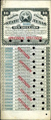1879. $10 Specimen baby bond. Red specimen overprints, POC's and blue "00000" serial numbers. Face has Texas "Star" vignette in middle and is printed in black. 20 miniature coupons on bottom for 40 cents each. "Issued By Authority of and Act of the Legislature of the State of Texas. Approved April 21st, 1879". 4% bond. Back is in green and has bond legend describing purpose of bond which was to retire old Texas state debt. Extremely rare Texas baby bond. ABNC.