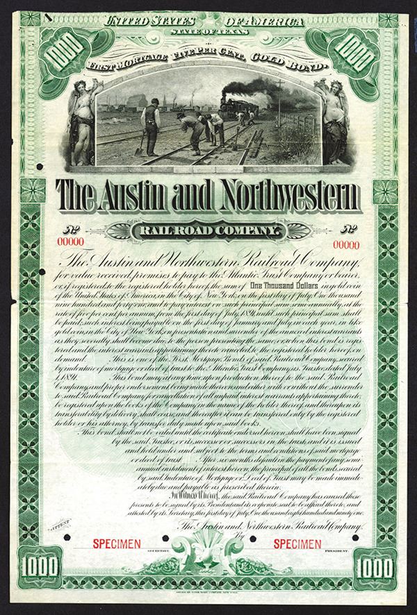 Texas, $1000, Specimen 1st Mortgage 5% Gold Coupon Bond (missing coupons), Black on green, track workers with approaching train, Specimen overprints, Would be in VF condition but the top margin is cut into, still extremely rare and attractive. This is the example listed in Cox and very possibly unique. originally sold for $1350.
