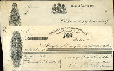 ca.1861-1874. 3 different banks represented in this group. All are either exchanges or demand notes. 1). The Bank of New South Wales. Brisbane. 1866. First of Exchange. VF condition; 2). Commercial Banking Company of Sydney. Sydney. 1861. First, Second and Third of Exchanges. Correspondent bank in London, England. The First of exchange is in Fine condition with toning on right margin and tear on lower right, and the 2nd and 3rd of exchanges in VG or Good condition with toned or dameged right margins; 3). Bank of Australia. 1874. Demand Note. All are printed on thick india type of paper. Either arms vignettes or ornate counterfoils. Printed by Perkins, Bacon & Co., London. Scarce group. PBC
