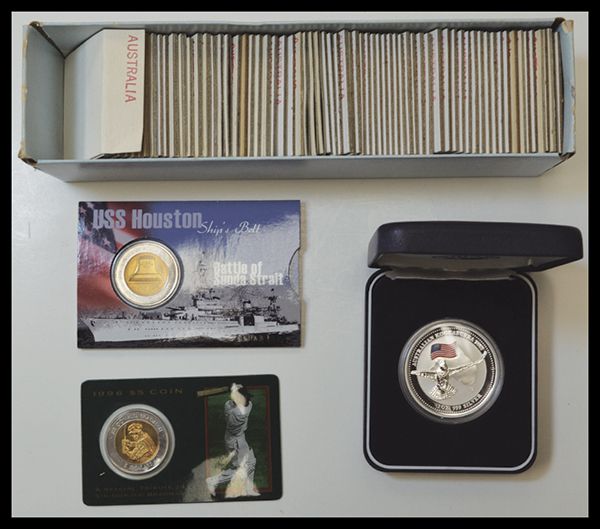 Australia Coin Accumulation in 2x2inch Flips with Many Silver Pre-decimal Issues. Lot of 60+ Coins. Highlights include 9 Different 1 Florin Coins, 1940-44 including 1942 and 1944 AU-BU; Shilling Issues (6), 1916 (VG), 1939-54 Issues, mostly XF to AU; Six Pence Issues including 1942D in CU; Decimal Issues including 1966 (2) Unc,; Numerous small Decimal Issues; 2002, $1, 1 Ounce, .999 Silver Kookaburra with colorized American flag in proof; 1996 $5 Bradman and 2002 USS Houston Commemorative coins in holders. Attractive and useful group of coins unsearched for varieties, weight approximately 2.5 lbs.