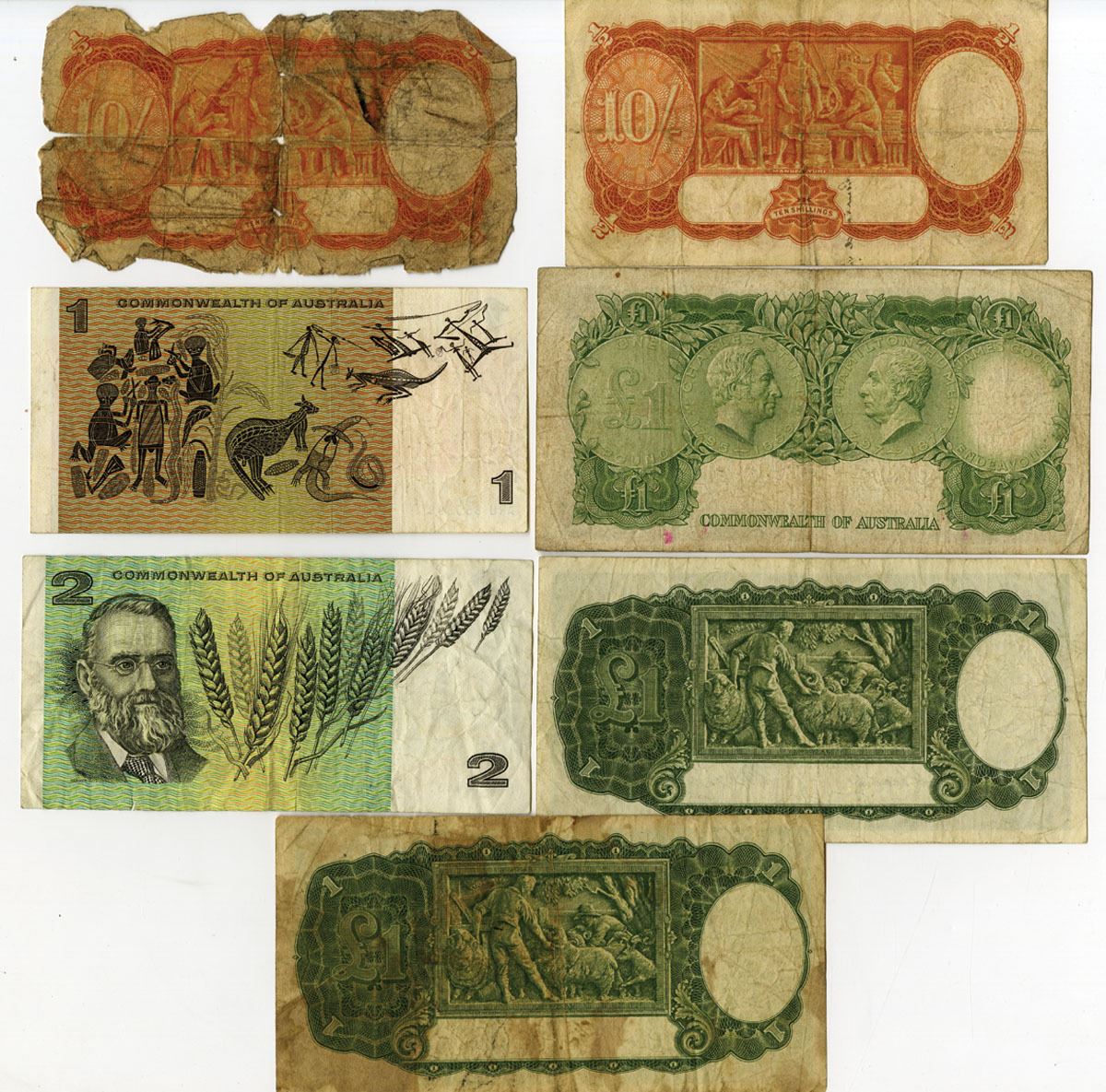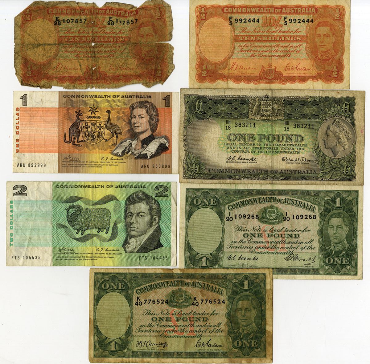 Australia, ND (1939)-ND (1969). Lot of 7 Issued Banknotes, Includes: 10 Shillings, ND (1939) (2); 1 Pound, ND (1942 to 1949) (2); 1 Pound, ND (1953-1960); 1 Dollar, ND (1969); 2 Dollars, ND (1968). Notes range from Good to Fine condition. (7).