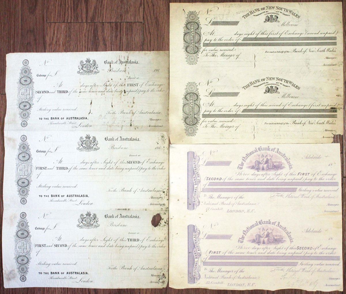 Adelaide, Melbourne & Brisbane, Australia. Lot of 3 uncut proof exchanges. Includes Adelaide Branch of the National Bank of Australasia 1867 Proof Uncut First & Second Bill of Exchange Pair, Purple text with Trio of allegorical figures and lion at top center; Melbourne Branch of the Bank of New South Wales, 1870s Proof Uncut First & Second Bill of Exchange Pair, Black text with small coat of arms at top center; and Brisbane Branch of the Bank of Australasia, 1860s Proof Uncut Sheet of First/Second/Third Exchange Trio, Black text with United Kingdom's Royal Coat of arms at top center. All are in VG to Fine condition with notes in pencil, staining and other damaged elements. Rare and early Australia fiscal documents from the Perkins, Bacon Archives. (3 uncut sheets, 7 exchanges total).