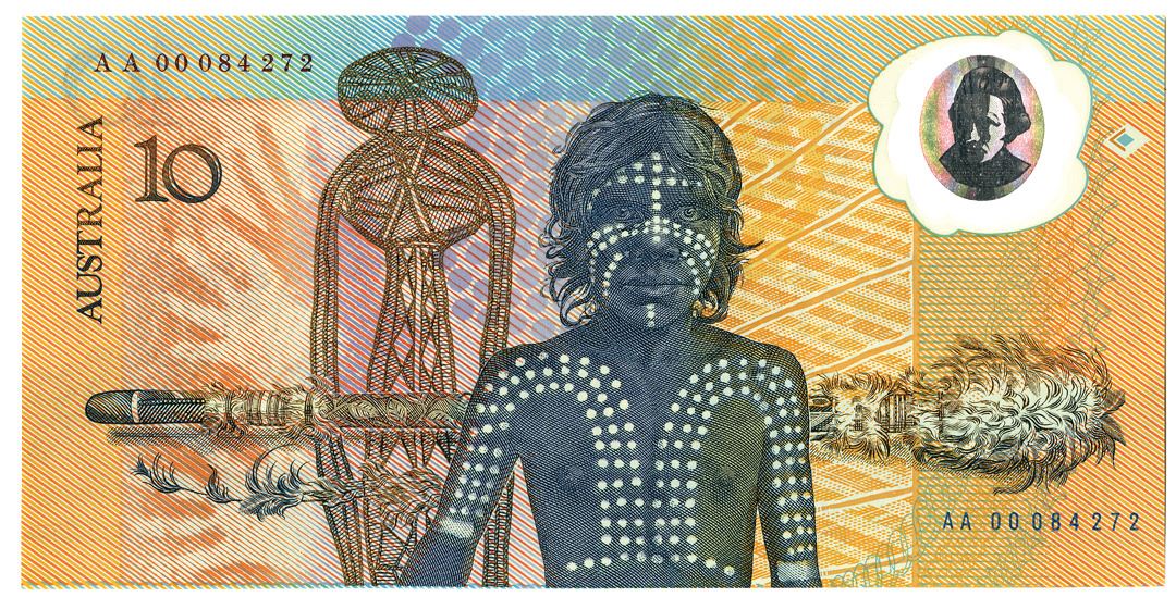 Australia..... 1988. $10, P-49a. Brown and green on m/c underprint on polymer plastic, Captain James Cook OVD at upper left, colonists across background; Cook's ship Supply at lower right shoreline. Back shows Aboriginal youth. Issued in folder. CU condition. Printer: NPA