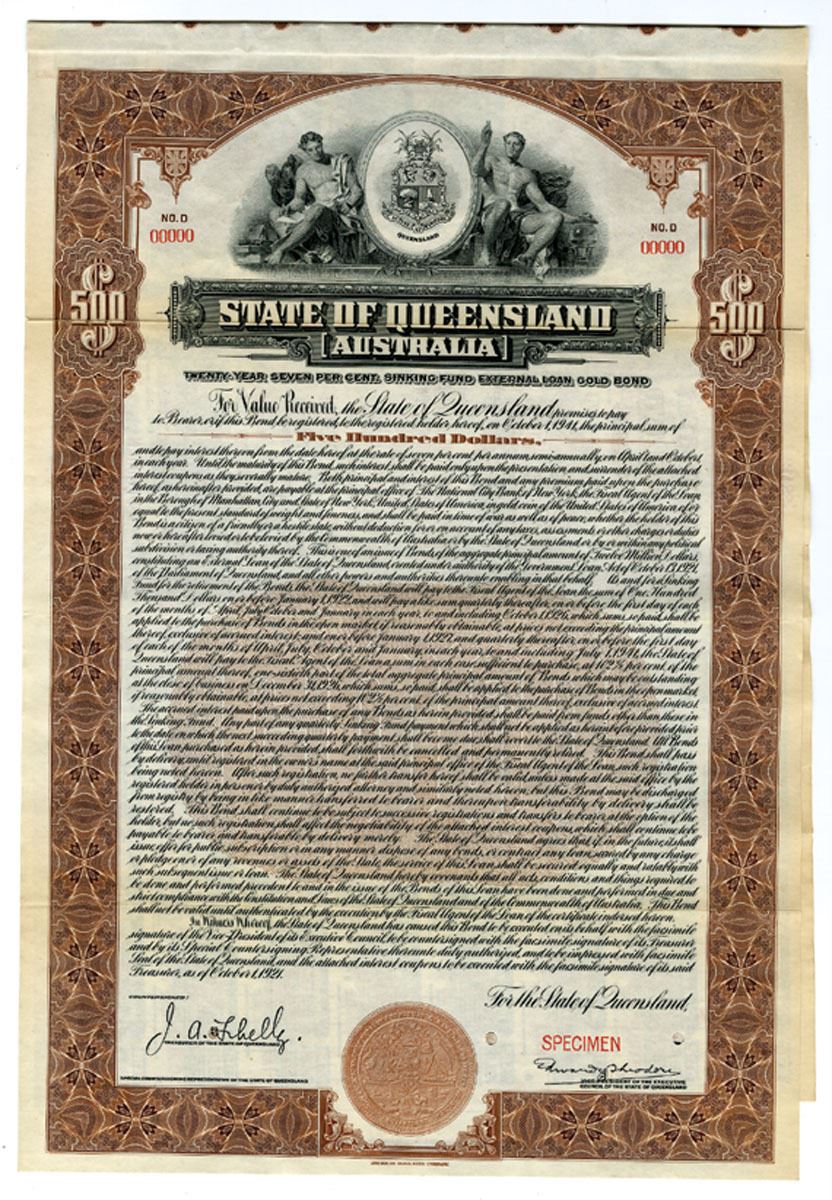 Queensland, Australia, 1921. 500 Dollar Specimen 7% Sinking Fund External Loan Gold Coupon Bond, Black text with brown border and underprint, Queensland Coat of Arms at top flanked by allegorical men, Specimen overprints and POCs, Fine to VF condition with splitting at fold lines, ABNC.