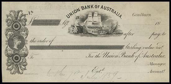 Goulburn, NSW. 18-- (1859 written in pencil on bottom). Printed on thick india type of paper in black. Vignette of lion, allegorical women, kangaroo and sailing ship in middle and counterfoil of Queen Victoria in profile in left counterfoil. VF to XF condition with light toning. Printed by Perkins, Bacon & Co., London. PBC.