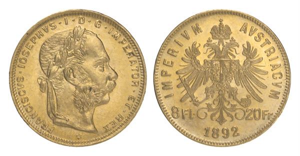 Austria, 1892, 8 Florins / 20 Francs, Gold, AU -BU,
