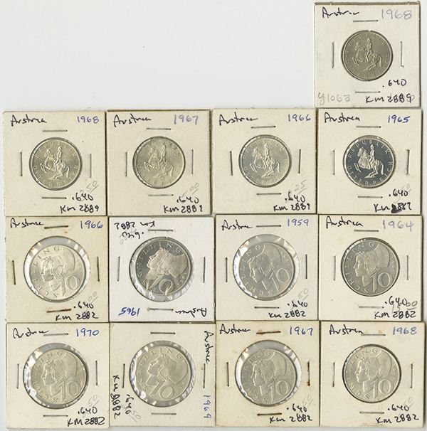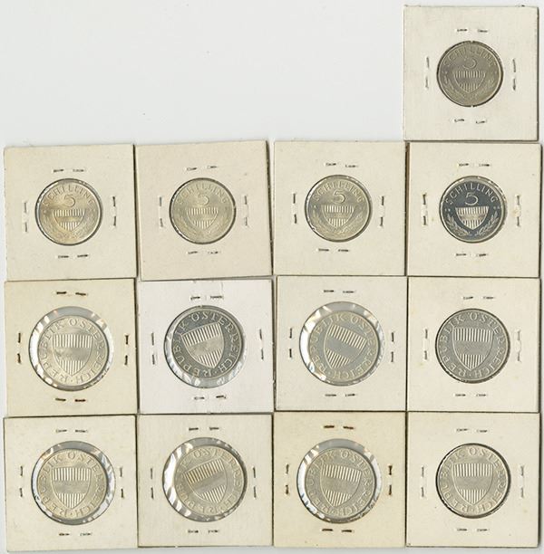 Austria, Lot of 13 coins, Includes date run of 5 Schilling, 1965 to 1968, KM-2889, generally Choice Unc or better; and date run of 10 Schilling, 1959 and 1964-1970, About to Gem Unc. (13)