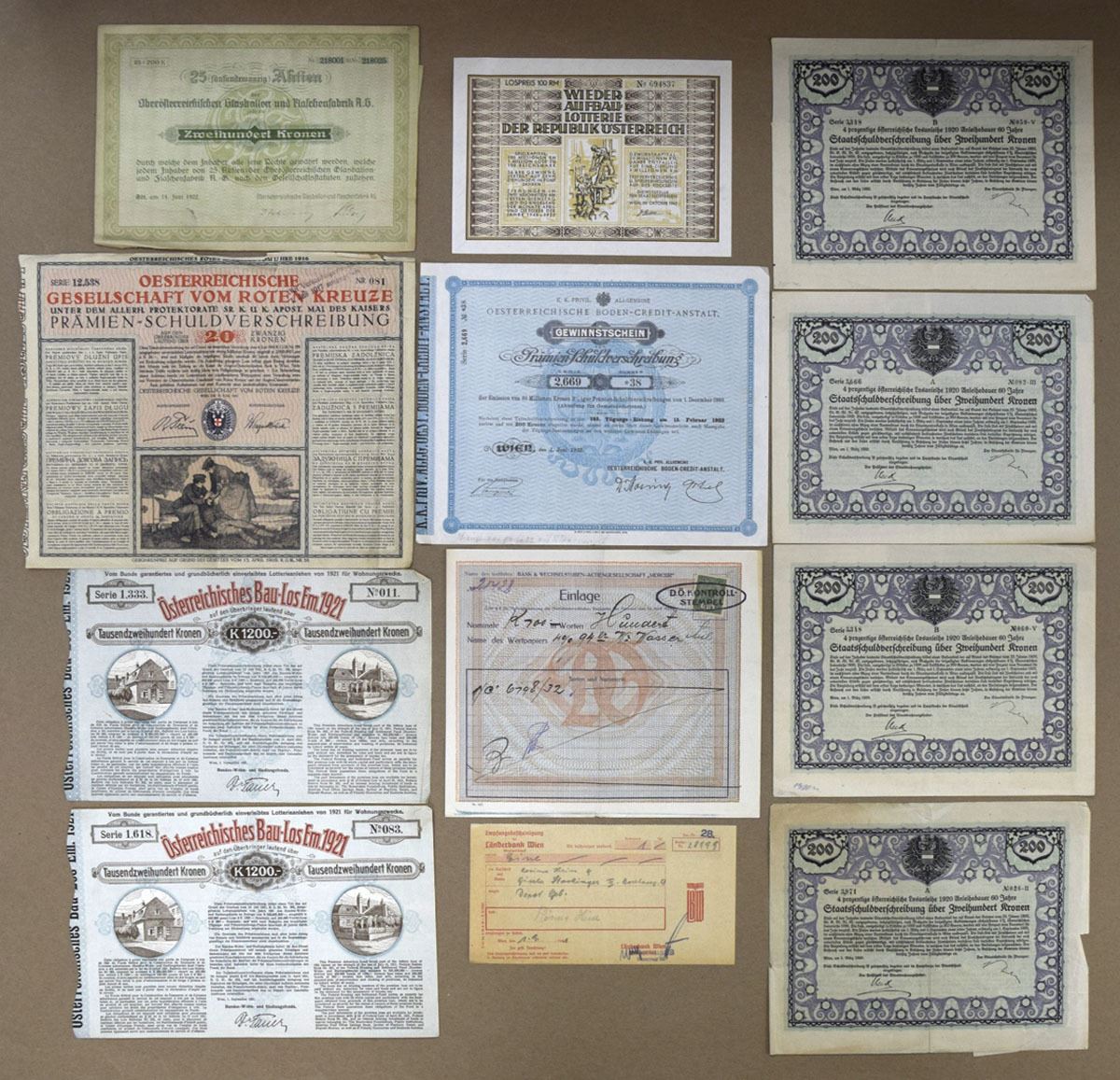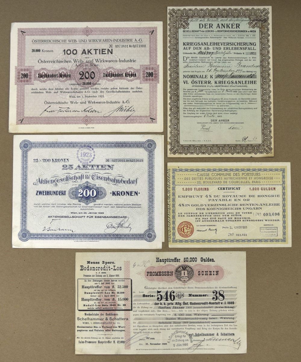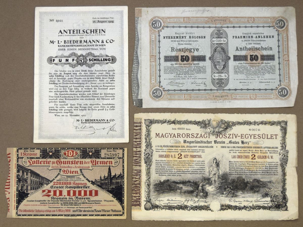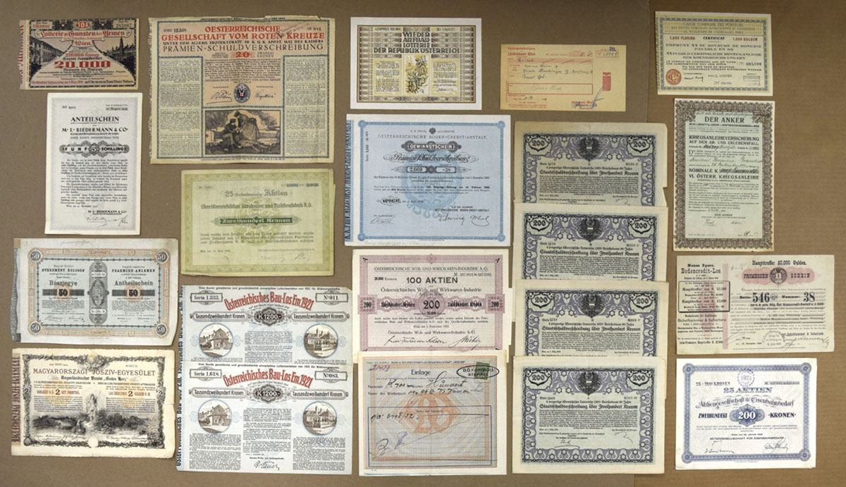 Austria, 1875-1925. Lot of 20+ Issued Lottery Tickets and Documents, Includes: 1870, Hungarian Royal Profit Loan; 1888, Hungarian Charitable Association; 1919, Lottery for the Benefit of the Poor - Vienna; 1925, M. L. Biedermann & Co. Bank and more. Documents range from VF to XF condition. (20+). Sold "AS IS" no returns accepted.