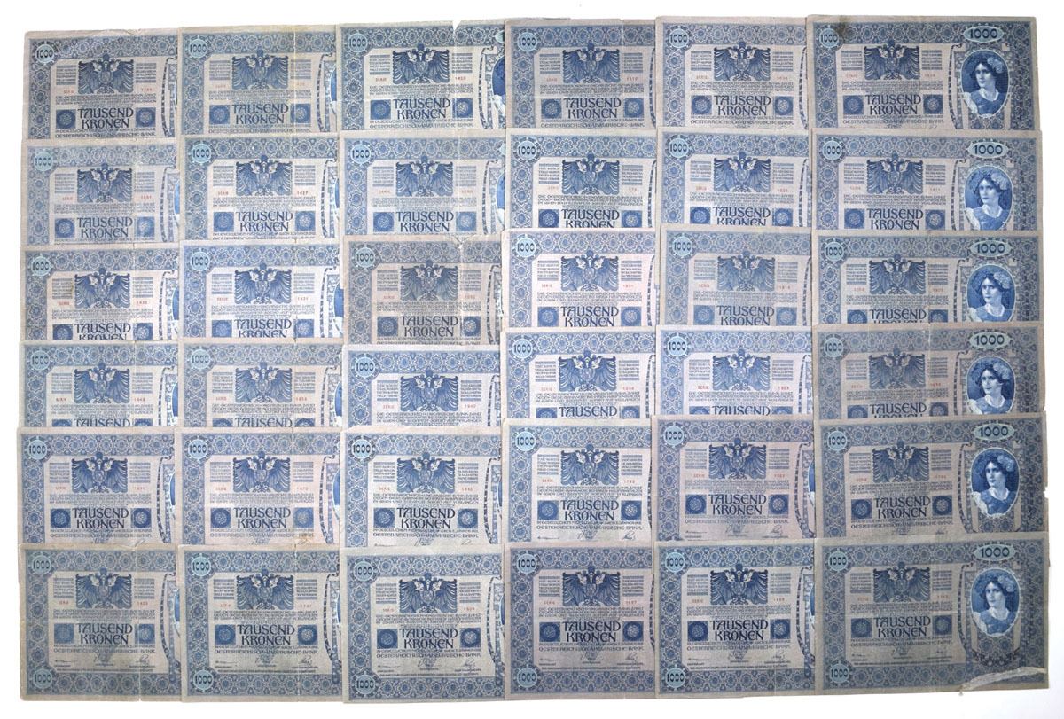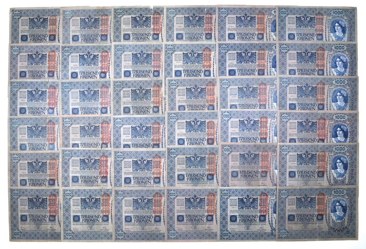 Austria, ND (1919- Old date 1902). 1000 Kronen, P-59 (36), Issued Group of Banknotes, Blue printing with woman in costume at left, Red stamp at right side, Back is blue and printed in German, Notes range from Fine to VF condition. (36). Sold "AS IS" no returns accepted.