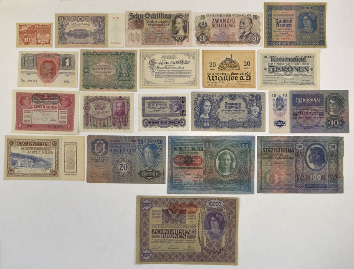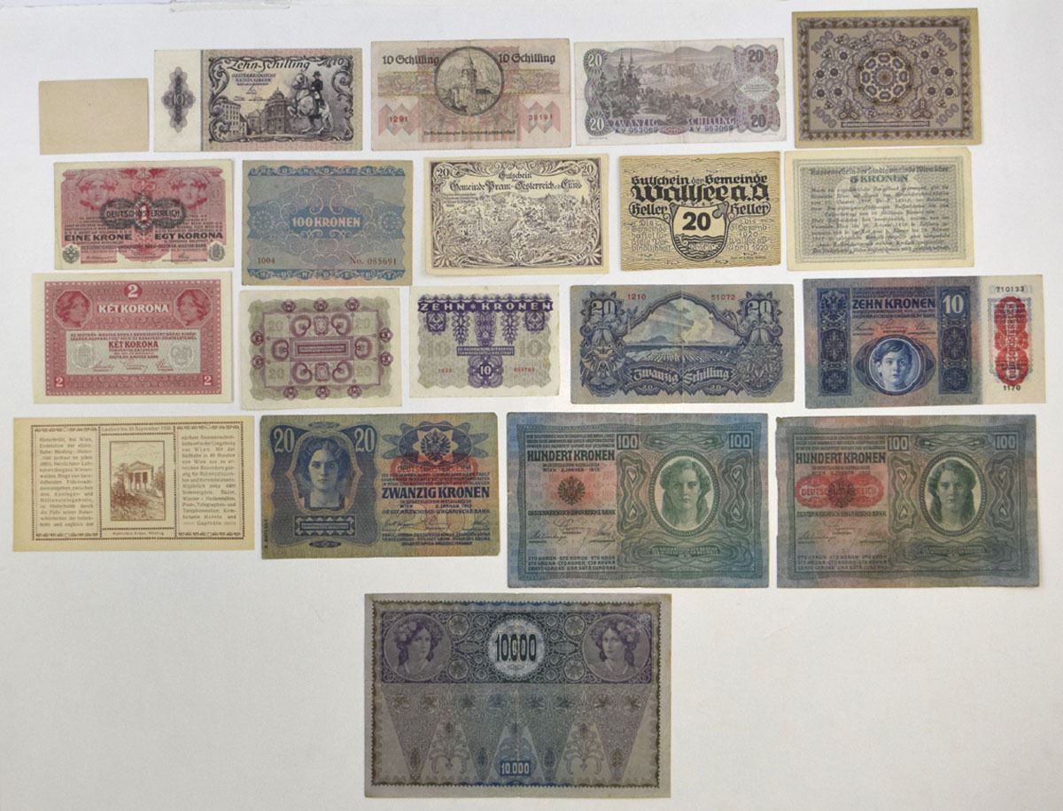 Austria, 1918-50. Lot of 20 Issued Banknotes from Pre World War I to post World War II, Notes range from VF to AU condition. (20). Sold "AS IS" no returns accepted.