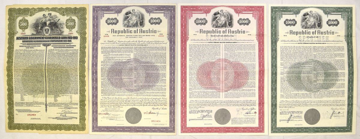 Austria, 1923-77. Lot of 4 Specimen Coupon Bonds, Includes: 1923, Austrian Government Guaranteed Loan $5007% Gold Coupon Bond; Republic of Austria $1000 Bonds of 1958, 1975, and 1977. All are marked Specimen, either with stamps or pin punches, Bonds range from VF to AU condition, printed by ABNC. (4). Sold "AS IS" no returns accepted.