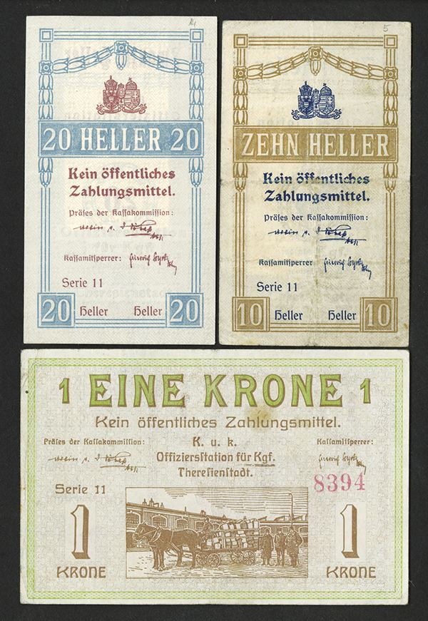 Theresienstadt Prisoner of War Scrip Notes lot of 3. Includes 10 Heller, AU, C 1473; 20 Heller, Unc., C 1474 and 1 Krone, AU, C 1475, Attractive and scarce trio of notes from a camp that was converted during WWII into the notorious concentration camp.