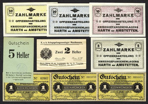 Austria. WWI P.O.W Currency. Kleinmunchen Heller 1915 (3) Uncirculated; Mauthausen 2 Heller. Paper rolled at bottom edge. Very Fine; Amstetten 20, 50 Heller; 5, 10 Kronen Extremely Fine or better; 5 Heller note when added together for 50 Heller. Uncirculated, paper tone to green paper. 9 pcs.