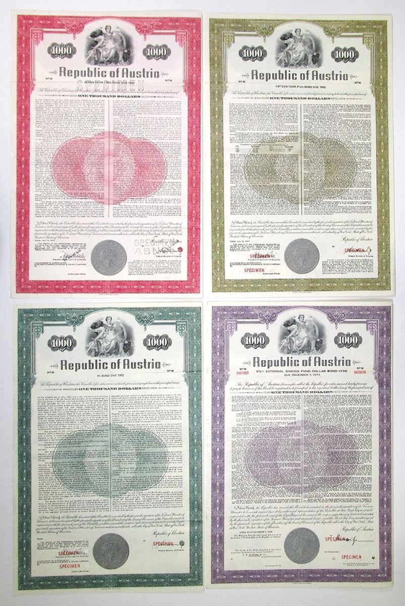 Austria, 1958 to 1977, Lot of 4 Specimen Bonds, Includes: 1958, $1000 5 1/2% External Sinking Fund Dollar Coupon Bond, Black with purple border; 1975, $1000 9% Coupon Bond, Black with green border; 1977, $1000 7.80% Seven Year Coupon Bond, Black with red border; 1977, $1000 8 5/8% Fifteen Year Coupon Bond, Black with olive green border. All have same vignette of allegorical woman with sword and shield at top center, Specimen overprints, POCs, are in AU to UNC condition, printed by ABNC. (4). Sold "AS IS" no returns accepted.