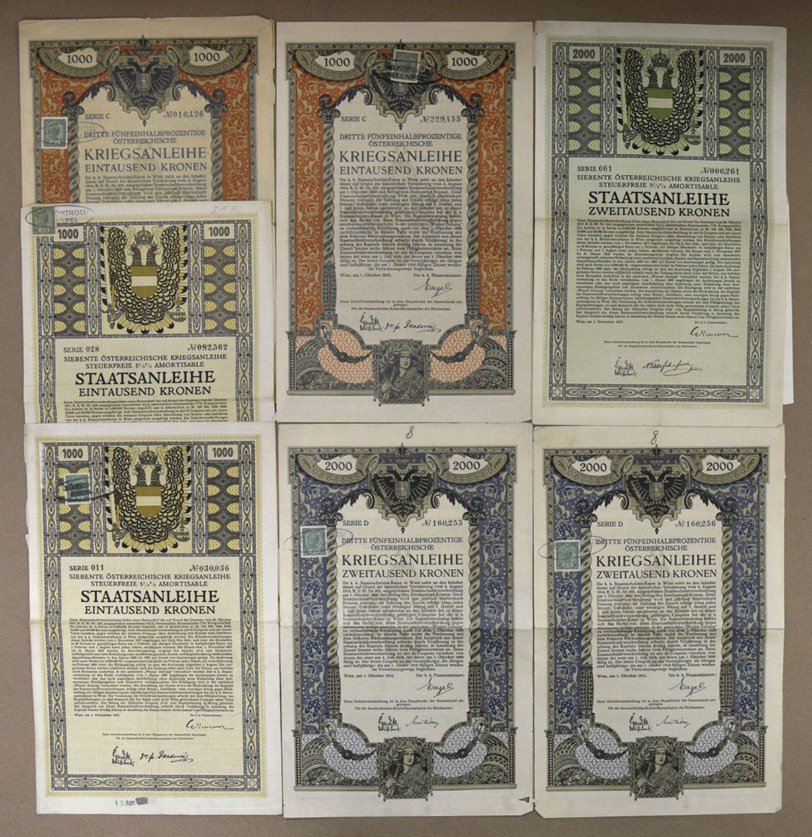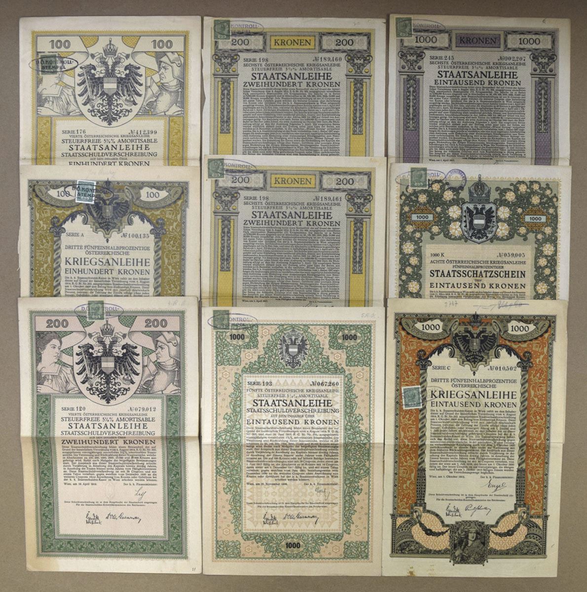 Austria, 1915-18. Lot of 15 I/U World War I era war bonds showcasing the Austro-Hungarian Empire’s wartime efforts, All have m/c printing with ornate borders and Imperial Crest, are printed in German, have Austrian revenue stamps, and range from Fine to VF+ condition. (15). Sold "AS IS" no returns accepted.