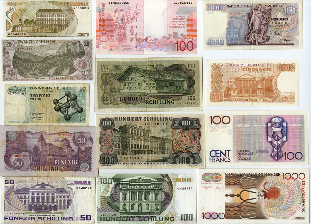 Austria and Belgium....., 1960 (1961) and, ND (1995-2001). Lot of 10+ Issued Banknotes, Includes: Austrian National Bank 50 Schilling, P-137a, 1962 (1963); 100 Schilling, P-138a, 1960 (1961); 20 Schilling, P-142a, 1967 (1968); 100 Schilling, P-145a, 1969 (1970); 20 Schilling, P-148, 1986 (1988); 50 Schilling, P-149, 1986 (1987); 100 Schilling, P-150, 1984 (1985); National Bank of Belgium 100 Francs, P-134b, 1975; Kingdom of Belgium 20 Francs, P-138, 1964; 50 Francs, P-139, 1966; 100 Francs, P-142a, ND (1982-94); 1000 Francs, P-144a, ND (1980-96); 100 Francs, P-147, ND (1995-2001). Notes range from VF to AU condition. (13). Sold "AS IS" no returns accepted.