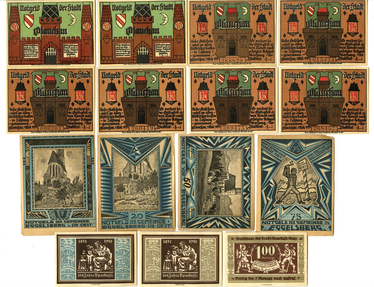Austria & Germany, 1919-20. Lot of 15 Issued Notgeld, Includes examples from Gleisdorf and Eggelsberg (Oberösterreich), among others. Designs vary widely and feature town gates, churches, architectural views, civic buildings, coats of arms, allegorical figures, and decorative geometric borders typical of early 1920s municipal Notgeld issues. Several notes display serial numbers, printed or manuscript signatures of municipal officials, and occasional accounting or cancellation markings. Notes range from Choice VF to XF condition overall with strong color and detail. (15). Sold “AS IS” no returns accepted.