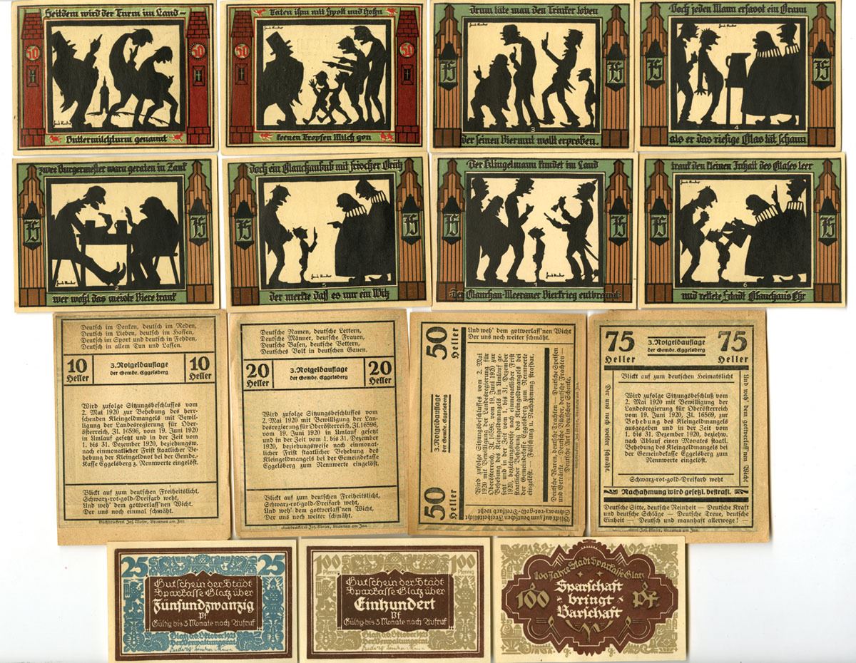 Austria & Germany, 1919-20. Lot of 15 Issued Notgeld, Includes examples from Gleisdorf and Eggelsberg (Oberösterreich), among others. Designs vary widely and feature town gates, churches, architectural views, civic buildings, coats of arms, allegorical figures, and decorative geometric borders typical of early 1920s municipal Notgeld issues. Several notes display serial numbers, printed or manuscript signatures of municipal officials, and occasional accounting or cancellation markings. Notes range from Choice VF to XF condition overall with strong color and detail. (15). Sold “AS IS” no returns accepted.