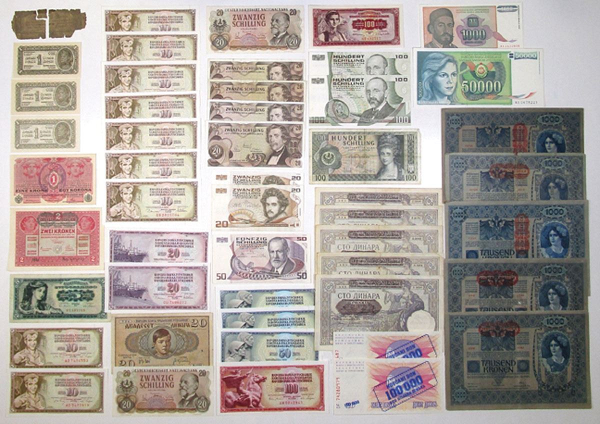 Austria and Southeastern Europe, 1860 to 1994. Lot of 48 Issued Banknotes, Includes: Austria – Imperial and Royal Mint Coin Note, 1860, 10 Kreuzer, P-A94; Austro-Hungarian Bank, 1916, 1 Krone, P-20; 1917, 2 Kronen, P-21; ND (1919 - Old Date 1902), 1000 Kronen, P-57a; P-58 (2); P-60 (2); Austrian National Bank – 1956, 20 Schilling, P-136a (2); 1967 (1968), 20 Schilling, P-142a (4); 1969 (1970), 100 Schilling, P-145a; 1984 (1985), 100 Schilling, P-150; 1986 (1987), 50 Schilling, P-149; 1986 (1988), 20 Schilling, P-148 (2). Bosnia-Herzegovina – 1993 (Old Date 1992), 100,000 Dinara, P-34b (2). Serbia – 1941, Serbian National Bank, 100 Dinara, P-23 (5). Yugoslavia – 1936, 20 Dinara, P-30; 1944, 1 Dinar, P-48 (3); 1955, 100 Dinara, P-69; 1965, 5 Dinara, P-77a; 1965, 100 Dinara, P-80c; 1968, 10 Dinara, P-82 (7); 1978, 10 Dinara, P-87a (2); 1978, 20 Dinara, P-88a (2); 1978, 50 Dinara, P-89 (3); 1988, 50,000 Dinara, P-96; 1994, 1000 Dinara, P-140a. Notes range from Fine to Uncirculated condition. (48). Sold "AS IS" no returns accepted.