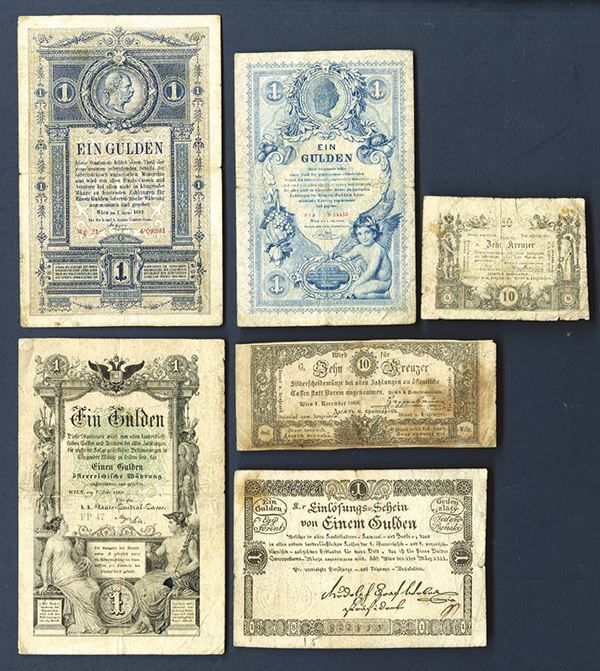 Austria. 1 Gulden, A44a; 10 Kreuzer, P-A93a, A94; Gulden P-A150; A153; A156. Generally Very Good to Fine, the A150 with a small hole. 7 pieces.