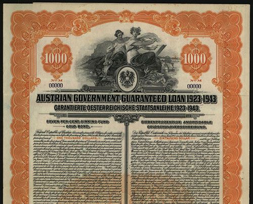 Austria, 1923, $1000, 7% Sinking Fund Gold Bond, Black on orange border and underprint, Allegorical woman over Arms of Austria. POC's. VF condition. Coupons attached. ABNC. Scarce bond.